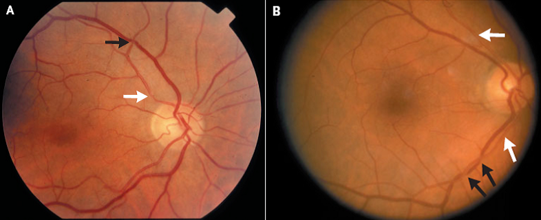 Hình 3. Bệnh võng mạc tăng huyết áp mức độ nhẹ (Nguồn: New England Journal of Medicine). A: bắt chéo động – tĩnh mạch (mũi tên đen) và co mạch khu trú (mũi tên trắng). B: bắt chéo động – tĩnh mạch (mũi tên đen) và dấu hiệu dây đồng (mũi tên trắng)