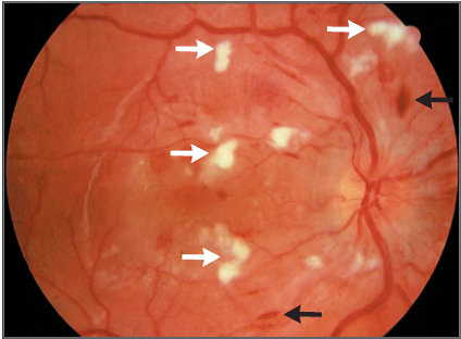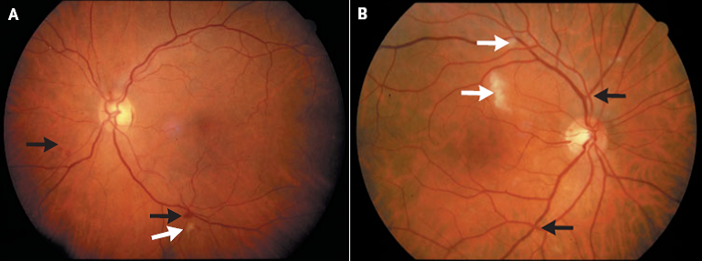 Hình 4. Bệnh võng mạc tăng huyết áp mức độ trung bình (Nguồn: New England Journal of Medicine). A: xuất huyết võng mạc (mũi tên đen) và xuất tiết bông (mũi tên trắng). B: xuất tiết bông (mũi tên trắng) và bắt chéo động tĩnh mạch (mũi tên đen)