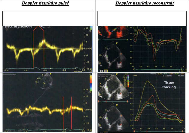 - Sự đo lường những thời gian lệch điện-cơ học xác định bởi thời gian lệch giữa sự khởi đầu của QRS và sự khởi đầu của sóng tâm thu trên Doppler pulsé tissulaire hoặc DTI.
