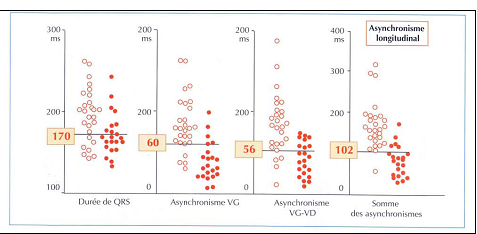 - Những tác giả này đã đo lường những thời gian lệch giữa QRS và sự khởi đầu của sóng "Sa" ở mức bờ tự do của thất phải, ở mức vách liên thất và ở mức vòng van hai lá của thành bên. Một thời gian lệch giữa hai thành thất trái > 60 ms cho phép dự đoán một sự cải thiện phân suất tống máu > 25% vào lúc 6 tháng. Thêm vào những lệch thời gian trong thất trái và bờ tự do của thất phải/bờ bên của vòng van hai lá, ngưỡng 102 ms đã cho phép dự đoán một sự đáp ứng dương tính với sự tái đồng bộ.